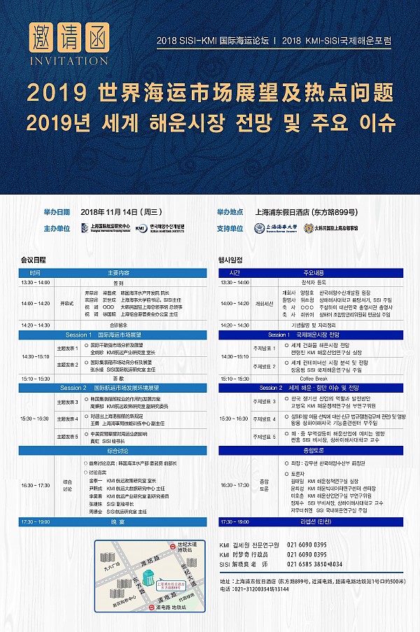 (2) 또 하나의 소식으로, 저희 KMI 중국연구센터에서 11월 14일(수) 상하이 푸동홀리데이인 호텔에서 '2018년 KMI-SISI 국제해운포럼'을 개최하여 다가오는 2019년 세계 해운시장을 전망하고, 해운/항만 주요 이슈들을 살펴보고자 합니다. 포럼 계획은 아래와 같으며자세한 내용은 첨부된 초청장을 참조해 주시기 바랍니다.